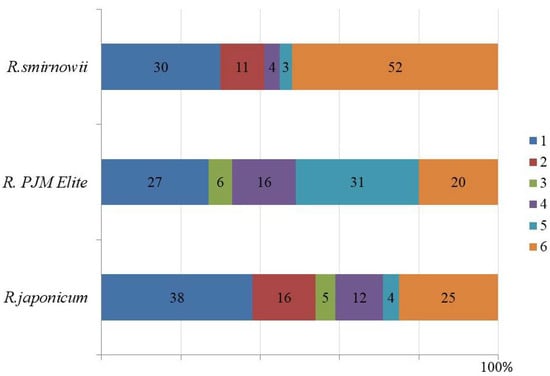 Balance of the main phenolic compounds in microshoots of various Rhododendron species (%): quercetin glycosides (1); kaempferol glycosides (2); myricetin glycosides (3); (−)-epicatechin (4); taxifolin (5); others (6).
