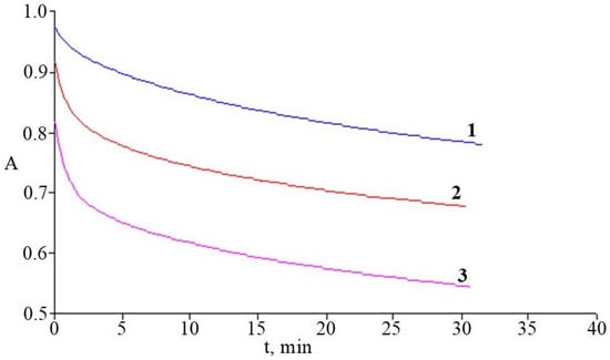 Kinetics of DPPH radicals’ recovery by antioxidant components of microshoots’ extracts: R. smirnowii (1), R. PJM Elite (2), R. japonicum (3). A—optical density of DPPH solution at λ = 520 nm. Concentration of the 80% ethanol extracts is 33.3 μgdw/mL.