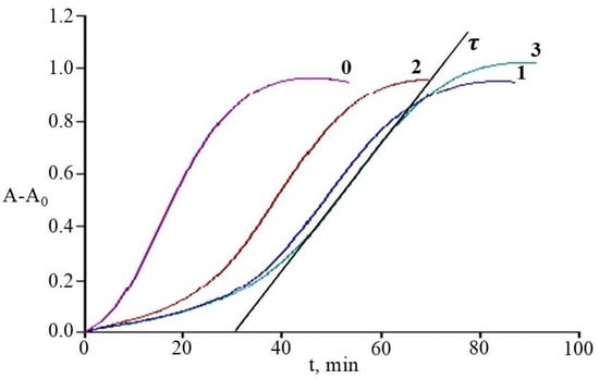 Kinetic curves of increase in optical density (A-A0) at λ = 234 nm (formation of DC) in the process of initiated oxidation of liposomes without introducing extracts (0); with added extracts R. smirnowii (1), R. PJM Elite (2), R. japonicum (3). APPH concentration = 0.33 µM; C = 0.06 μgdw/mgPCh; T = 37 °C; A0 is the optical density of DC at t = 0; τ-induction period.