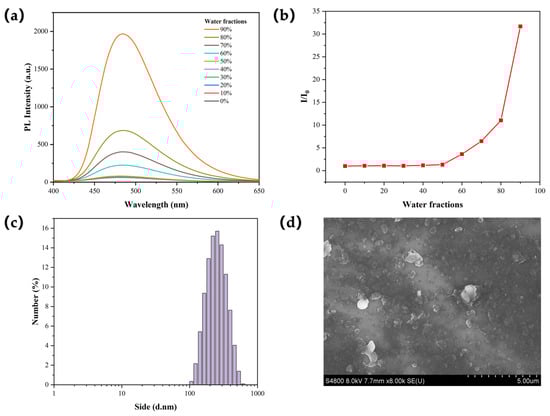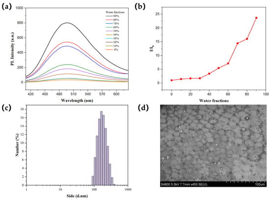 (a) Emission spectra of 2-TPE-thiophene in THF/H2O mixtures (concentration = 10 μM; λex = 331 nm). (b) Plots of the emission intensities of 2-TPE-thiophene in THF/H2O mixtures versus water fractions (fw = 0) at 498 nm. (c) The DLS plot of 2-TPE-thiophene in 90% (vol%) H2O/THF solution. (d) SEM of 2-TPE-thiophene in 90% (vol%) H2O/THF solution.