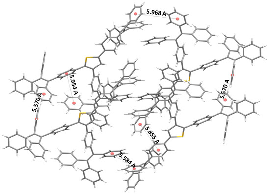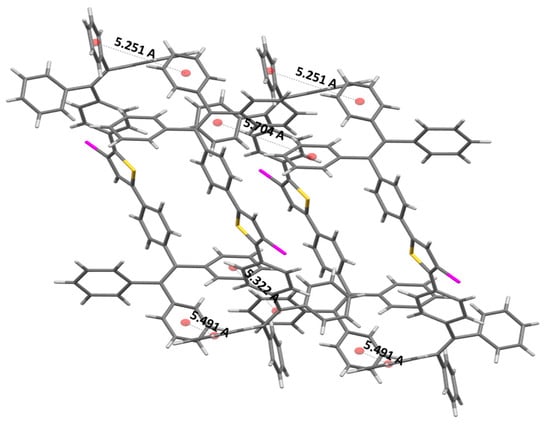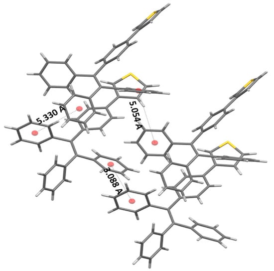 Previous studies have established that intramolecular interactions among the four phenyl rings of the TPE subunit are critical determinants of photoluminescence performance [26]. A comparative analysis of 2-TPE-thiophene and 3-TPE-thiophene (Figure 5, Figure 7 and Figure 8) reveals distinct differences in their intramolecular interactions. Specifically, 2-TPE-thiophene exhibits stronger C–H···π interactions and weaker π–π stacking compared to 3-TPE-thiophene. The enhanced C–H···π interactions in 2-TPE-thiophene contribute to a greater torsional distortion of the TPE core, reducing molecular planarity and thereby suppressing π–π stacking. This structural feature is closely associated with its high PLQY, as excessive π–π stacking is known to quench emission in solid states [27,28,29,30].