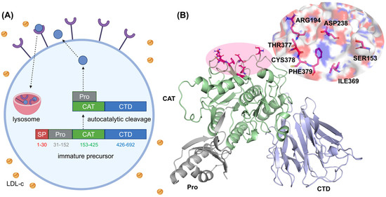 (A) An overview of PCSK9 synthesis and processing. Following its synthesis as a precursor in the endoplasmic reticulum, PCSK9 undergoes autocatalytic cleavage, exits the cell, binds to an LDLR, and directs the LDLR–PCSK9 complex for degradation in the lysosomes. (B) A structural representation of PCSK9, highlighting its prodomain, catalytic domain, and C-terminal domain. Key residues in the catalytic domain are emphasized for clarity.