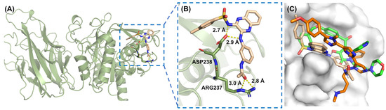 After high-throughput virtual screening (HTVS), 14,236 molecules were initially selected, which were then refined to 1423 molecules through standard-precision (SP) screening. Finally, extra-precision (XP) screening further narrowed the pool to 142 candidates. During the three stages, certain molecules with an unreasonable geometric structure or chemical constraint were excluded. In AutoDock Vina, the top 5000 molecules were selected based on their docking scores. A comparative analysis was conducted to ensure consistent results in both methods by matching the molecular IDs. Among the 142 molecules from XP screening, the first common candidate, AK-968/12164422 (hereafter referred as AK) was identified. For this candidate, the docking score with PCSK9 under XP precision was −5.9 kcal/mol, and in AutoDock Vina it was −8.0 kcal/mol, indicating comparatively strong binding affinity across two different docking precisions. To better assess the binding affinity of the candidate, the docking scores of two known active inhibitors (SBC and RIm) were also obtained using the same XP precision scoring function, with −4.3 kcal/mol for RIm and −4.6 kcal/mole for SBC, which are a little lower than the identified inhibitor AK. The binding pose of this candidate with PCSK9 protein is illustrated in Figure 2A, and the key residues ARG237 and ASP238 that interacted with AK in the binding pocket are shown in Figure 2B. A network of hydrogen bonds between the protein and the AK molecule, specifically involving ASP238 OD2 with AK N2 (2.9 Å) and AK N4 (2.7 Å), as well as ARG237 NE with AK O3 (3.0 Å) and ARG237 NH2 with AK O3 (2.8 Å), highlights significant electrostatic interactions that strengthen the protein–ligand association. Figure 2C shows the alignment of the three ligands (SBC, RIm, and AK) within the binding pocket, and similar binding poses were detected between the ligands and the protein, indicating the reliability of the small-molecule AK selected by virtual screening compared to the two known active inhibitors.