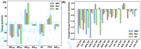 (A) The binding free energy and each energy term of three simulated complexes in the PPC model. (B) Decomposition of the binding free energy for each residue in three systems using the MM/GBSA method.