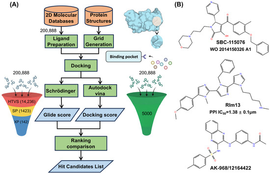 (A) Chemical structures of SBC-115076, RIm13, and hit candidate molecule AK-968/12164422 identified by virtual screening methods. (B) The procedure in the virtual screening for identifying promising drug candidates.