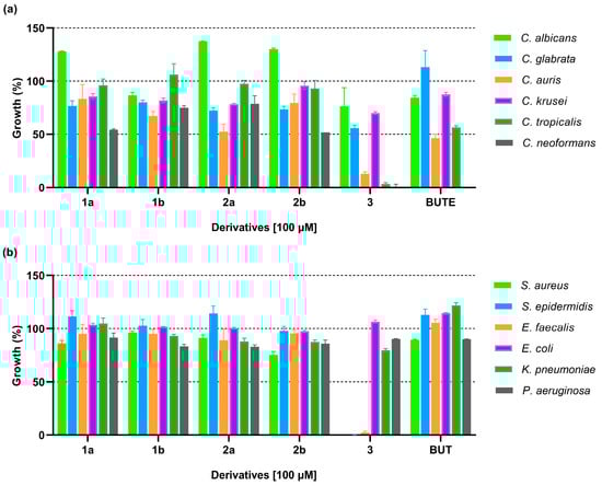 Some general remarks can be drawn from data reported in Figure 3a: a moderate inhibitory activity (<50% of growth reduction compared to the control) was observed for derivatives 1a and 2b on C. neoformans, and for derivative 2a on C. auris. Remarkably, a high inhibitory activity was measured for derivative 3, which proved to be effective to different extents against several microorganisms. Indeed, while this compound displayed moderate activity against C. albicans, C. glabrata, and C. kruzei, it exhibited a potent inhibitory effect against clinically relevant fungi such as C. auris, C. tropicalis, and C. neoformans. This finding is of particular interest because the non-albicans Candida species exhibit varying levels of resistance to commonly used antifungals, thus evading present therapeutic options; for instance, the resistance profile of C. auris includes strains that display resistance to polyenes, azoles, and echinocandins, with about 90% resistant to fluconazole [29]. The widespread use of this antifungal agent has also led to the frequent identification of fluconazole-resistant strains, which are responsible for treatment failures in Cryptococcal meningitis [30].