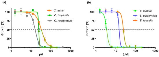Dose–response curves of derivative 3 against fungal (a) and bacterial (b) species. Curves were obtained by using a nonlinear regression equation and a variable slope model (log(inhibitor) vs. normalized response–variable slope. The IC50 values are represented by the x-coordinates corresponding to the half-maximum growth (dotted lines set at y = 50%) (GraphPad Prism version 9.4.1 for Windows).