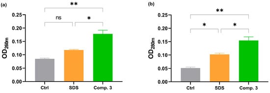 Effects of derivative 3 (12.5 µM) on intracellular nucleic acid ((a) OD 260 nm) and protein ((b) OD 280 nm) leakage in S. aureus ATCC 25923. * p ≤ 0.05, ** p ≤ 0.01 (as determined by Ordinary One-Way ANOVA for multiple comparisons, GraphPad Prism version 9.4.1 for Windows).