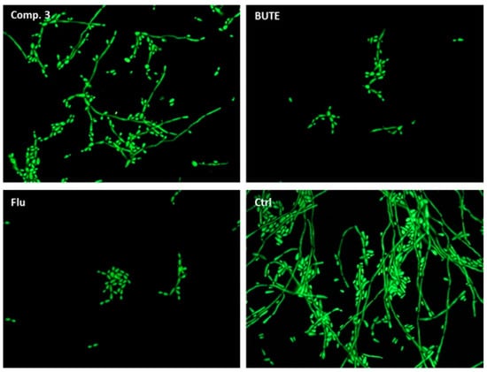 A key virulence factor expressed by some Candida species that significantly contributes to their pathogenicity is the transition of yeast cells to filamentous cells. The formation of a germ tube and mycelium is an essential process for host tissue invasion, damage to mucosal epithelia, escape from host immune cells, and blood dissemination. The ability of the xanthone-based 3 to weaken fungal virulence was investigated in C. tropicalis. For this purpose, C. tropicalis was cultured for 2 h in an RPMI-1640 medium supplemented with serum at 10% and containing derivative 3, butenafine hydrochloride, and fluconazole at IC50 values, and then spotted on glass slides and imaged after staining with the cell-permeant, fluorogenic nucleic acid stain SYTO9. Fluorescence images in Figure 6 clearly reveal that butenafine hydrochloride and fluconazole led to a considerable reduction in fungal cells, together with an almost complete absence of hyphae forms, while the prototype 3 only interfered with the yeast–hyphal transition, resulting in a visible reduction in the number of hyphae compared to untreated C. tropicalis cells.
