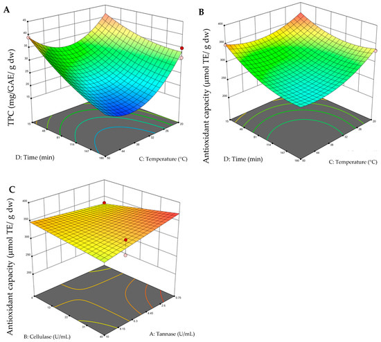 Three-dimensional surface graphs from enzyme-assisted extraction (EAE). (A) Total polyphenol content (TPC) (time–temperature); (B) antioxidant capacity (time–temperature); (C) antioxidant capacity (tannase–cellulase). On the color scale: blue represents low values and red high values.