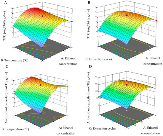 Three-dimensional surface graphs from pressurized liquid extraction (PLE). (A) Total polyphenol content (TPC) (ethanol concentration–temperature); (B) total polyphenol content (TPC) (ethanol concentration–extraction cycles); (C) antioxidant capacity (ethanol concentration–temperature), and (D) antioxidant capacity (ethanol concentration–extraction cycles). On the color scale: blue represents low values and red high values.