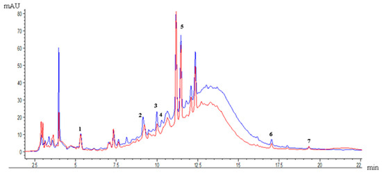 Profile of phenolic compounds from pisco grape pomace: (1) gallic acid, (2) catechin, (3) epicatechin, (4) 4-hydroxybenzoic acid, (5) quercetin-3-rutinoside hydrate, (6) quercetin-3-O-rhamnoside, (7) kaempferol. Comparison of the profile of phenolic compounds of pisco grape pomace enzyme-assisted extraction (red) and pressurized liquid extraction (blue).