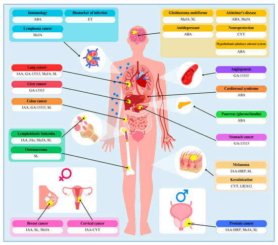 Figure 2. Diversity of beneficial activities of plant hormones toward human disease and disorders. Abbreviations: ABA—abscisic acid, CYT—cytokinin, ET—ethylene, GA-13315—13-chlorine-3,15-dioxy-gibberellic acid methyl ester, IAA—indole-3-acetic acid, IAA-HRP—indole-3-acetic acid/horseradish peroxidase complex, JAs—jasmonates, LR2412—tetrahydrojasmonic acid (trade name), MeJA—methyl jasmonate, SL—strigolactone.