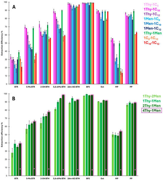 (A) Extraction efficiency for the different analytes and NADESs evaluated (n = 3). (B) Extraction efficiency for thymol-menthol based NADES. The selected NADES is highlighted with a pink star symbol.