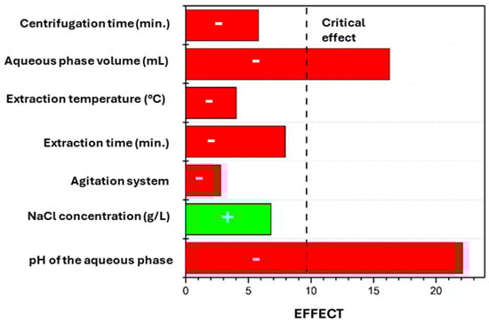 A two-step multivariate method was used to select and optimize the experimental conditions to perform the simultaneous extraction and preconcentration of the nine target analytes from aqueous standards. In the first step, the effect of the experimental variables on the EE% was evaluated using a two-level Plackett–Burman experimental design. The variables and the specific condition selected for each level (coded as −1 and +1) were pH of aqueous phase (level −1: pH 2; level +1: pH 9), NaCl content (level −1: 0.00 g L−1; level +1: 20.0 g L−1), agitation mode used for dispersion (level −1: manual agitation; level +1: ultrasonic bath agitation), extraction time (level −1: 1.0 min; level +1: 5.0 min), extraction temperature (level −1: 25 °C; level +1: 50 °C), aqueous phase volume (level −1: 5.00 mL aqueous phase; level +1: 10.0 mL aqueous phase), and centrifugation time (level −1: 3.0 min; level +1: 5.0 min). All extraction studies were carried out using aqueous standards and 100 µL of the 4Thy-1Men NADES. The overall response (OR) obtained from the individual EE found for each analyte in the corresponding experiment was used as the analytical response of the system (see Equation (1)).