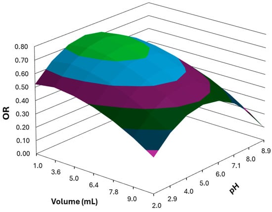 The aqueous phase pH and volume were optimized using a five-level central component design (CCD) and response surface model (RSM). The influence of these variables was examined between 1.00 and 9.00 mL for aqueous phase volume and between 2.0 and 8.0 for aqueous phase pH, using only 11 experiments (22 experiments to evaluate first-order effects; 2 × 2 experiments to evaluate second-order effects; and three replicates of the central point experiment). All the extractions were performed using 100 µL of the 4Thy-1Men NADES and the experimental conditions previously established in the screening step. The OR was used as the analytical response of the system (see Equation (1)). A more detailed description of the CCD experiments and the data evaluation procedure used to assess the quality of the model and the construction of the RSM can be found in Section S1.2 of the Supplemental Material. From the obtained mathematical model (see Equation (S6)), the response surface plot shown in Figure 3 was constructed. The OR of the system was found to be maximal and stable within the range of aqueous phase volumes of 1.00 to 5.00 mL and pH values of 4.0 to 6.0. To achieve the highest enrichment factor, an aqueous phase volume of 5.00 mL was established as optimal. On the other hand, the pH of the aqueous phase was set at approximately 5.0, although setting an exact pH value is not critical if it remains within the range of 4.0 to 6.0. The final conditions for the microextraction procedure are summarized in Section 3.4.