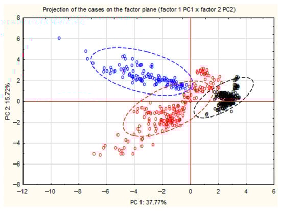 The results of the PCA are presented in Figure 2. Based on the plot of the projection of cases onto the plane of the first and second principal components (PC1 and PC2) for three species of fungi, the following conclusions can be drawn: