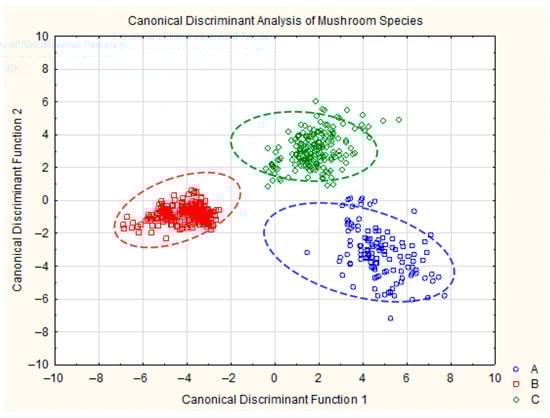 Summary of discriminant function analysis. Variables in the model: 20; grouping: mushroom species (3 groups); Wilks’ Lambda: 00977; adj. F (40.1026) = 233.92; p < 0.0000.