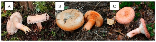 Appearance of Lactarius pubescens (A), Lactarius deliciosus (B) and Lactarius torminosus (C).