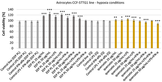 Viability [%] of astrocyte cell line CCF-STTG1 under hypoxic conditions after treatment with ethanolic extract of Polish propolis (EEP-PL) or quercetin (Q), alone or in combination with lipopolysaccharide (LPS, 200 ng/mL), interferon-alpha (IFN-α, 100 U/mL), or both (LPS + IFN-α). Cells were incubated with EEP-PL or quercetin at final concentrations of 25 and 50 µg/mL. Cell viability was assessed by MTT assay, and results are expressed as mean ± standard deviation (SD) from three independent experiments (n = 3). Statistical significance was evaluated using the two-tailed Student’s t-test, with comparisons made between treated groups and their respective stimulated controls (i.e., EEP + LPS vs. LPS alone, Q + IFN-α vs. IFN-α alone, etc.). Statistical analysis was performed using STATISTICA v13.1 software (StatSoft, Tulsa, OK, USA); * p < 0.05, ** p < 0.01, *** p < 0.001 vs. corresponding control group.