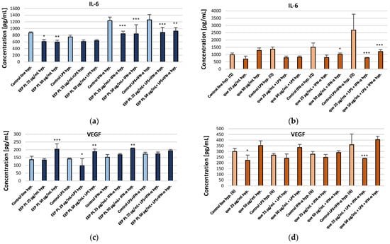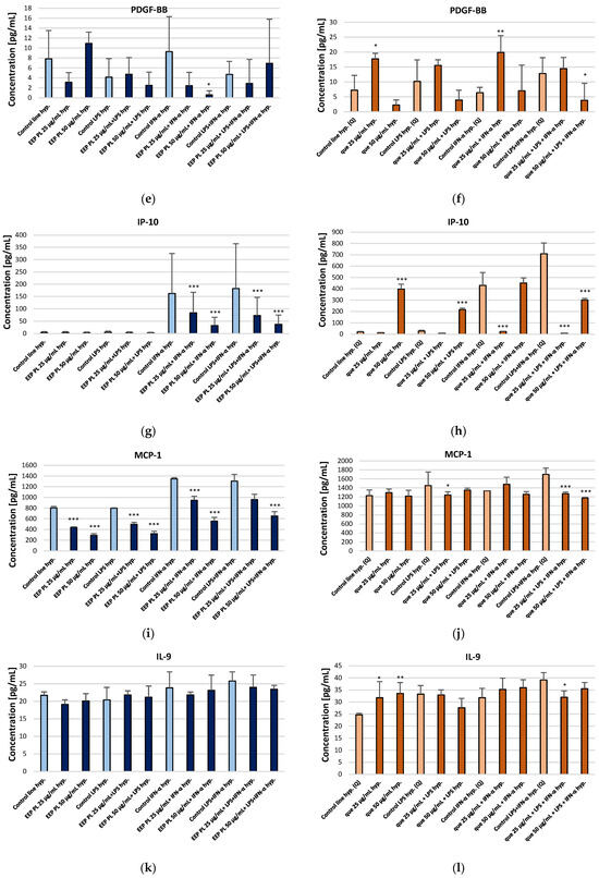 Concentrations of IL-6 (a,b), VEGF (c,d), PDGF-BB (e,f), IP-10 (g,h), MCP-1 (i,j), and IL-9 (k,l) [pg/mL] secreted by CCF-STTG1 astrocytes cultured under hypoxic conditions and treated with Polish ethanolic extract of propolis (EEP-PL) or quercetin (Q), at 25 and 50 µg/mL in combination with IFN-α, LPS, or both. Data are expressed as mean ± SD of three independent experiments. Statistical significance was determined using one-way ANOVA followed by Fisher’s LSD post hoc test (* p < 0.05, ** p < 0.01, *** p < 0.001) in STATISTICA 13.1 software. Comparisons were made versus the respective stimulated control groups (LPS, IFN-α or LPS + IFN-α alone). Further details can be found in the Supplementary Materials.