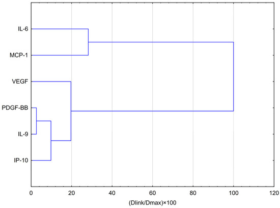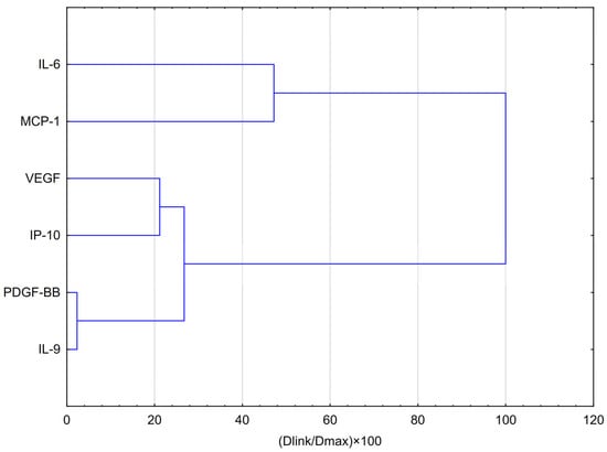 HCA analysis (Figure 3) showed that VEGF formed part of this group at a slightly greater distance, suggesting a partially similar response pattern. In contrast, IL-6 and MCP-1 clustered separately at the highest linkage distance (~100% of Dmax), indicating that their expression profiles differ substantially from those of the other cytokines and are more closely related to each other than to the remaining variables.