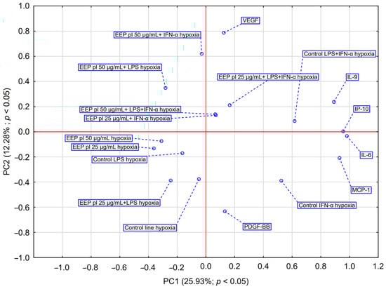 PCA analysis (Figure 4) showed that EEP-PL at a final concentrations of 50 μg/mL with IFN-α and EEP-PL at a final concentration of 50 μg/mL with LPS showed a similar activity on cytokine secretion by astrocytes (upper left quadrant). Similar effects were also demonstrated for EEP-PL 50 μg/mL + LPS + IFN-α, EEP-PL 25 μg/mL + IFN-α and EEP-PL 25 μg/mL + LPS + IFN-α (upper right quadrant). Similar effects on each other were also exhibited by EEP-PL 50 μg/mL, EEP-PL 25 μg/mL and EEP-PL 25 μg/mL + LPS (lower left quadrant). Of note, the sample treated with EEP 50 µg/mL + IFN-α shows the greatest shift along the PC2 axis in the PCA space among all EEP combinations. The variables with the greatest impact were IL-6, IP-10, MCP-1, and IL-9, all showing a high index (>0.85), suggesting that these cytokines play a key role in the differential response profiles to EEP-mediated stimulation in the cells studied. PCA also showed that EEP 50 µg/mL + IFN-α and EEP 25 µg/mL + LPS had the greatest coordinate magnitude in the PCA space, indicating strong separation from other conditions This suggests that these conditions may lead to a more pronounced modulation of the cytokine profile.