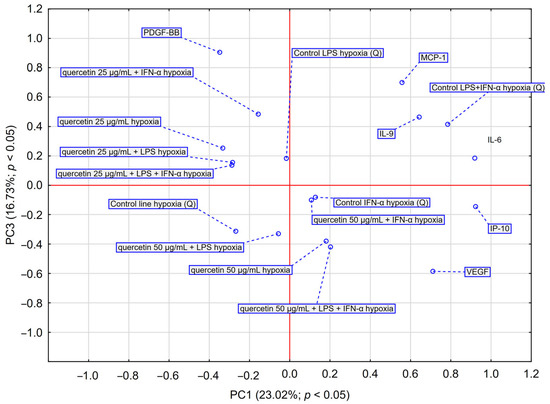 PCA score plot illustrating data regarding the impact of quercetin (25–50 μg/mL) on the secretion of IL-6, VEGF, PDGF-BB, MCP-1, IP-10 and IL-9 by astrocyte cell line CCF-STTG1 stimulated with LPS and/or IFN-α treatment with quercetin in hypoxia conditions. Abbreviation: PC—principal component.