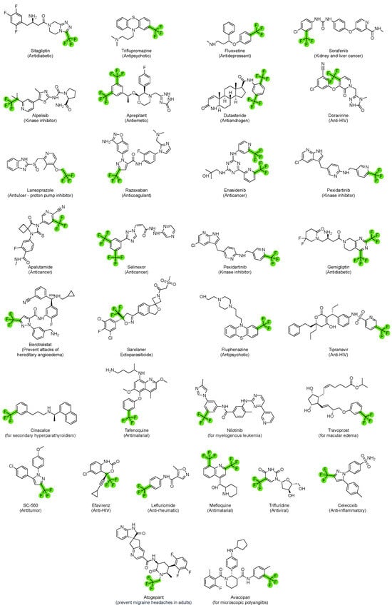 Based on the scope of this overview, the most relevant drugs containing the trifluoromethyl group have been grouped (Figure 3). As observed, there is a wide range of therapeutic applications for the compounds decorated with this versatile functional group. In addition to FDA-approved drugs, several relevant compounds have been investigated in recent decades, including navitoclax (for cancer and myelofibrosis), BAY 38–7271 (with analgesic and neuroprotective properties), and roniciclib (targeting various cancers, including small cell lung carcinoma and solid tumors) []. However, most of these molecules were discontinued primarily due to safety concerns.