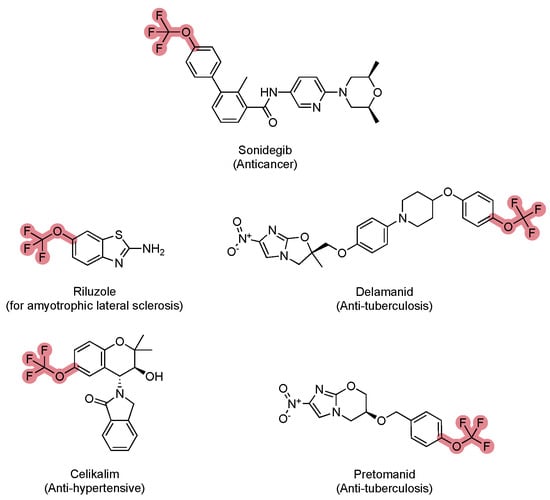 Examples of drugs bearing trifluoromethoxy groups (highlighted in pink) and their therapeutic applications.