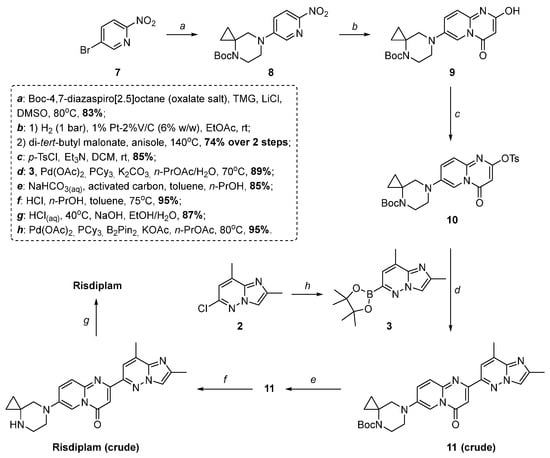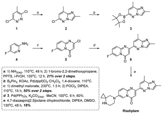 Risdiplam was first synthesized according to the pilot scheme outlined by Ratni et al. [13], as shown in Figure 1.