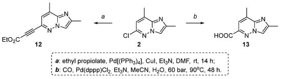 However, the synthesis of derivatives 12, 13 is also carried out via a metal-complex catalyzed reactions, i.e., coupling of compound 2 with ethyl propiolate in the presence of CuI, Pd[(PPh3)4] or carbonylation of compound 2 in the presence of Pd(dppp)Cl2, respectively (Figure 3).