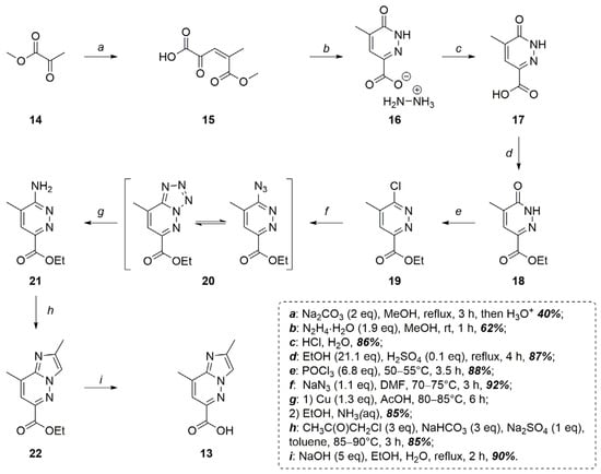 The synthesis of the target acid 13 started from commercially available methyl pyruvate 14, which, in the presence of Na2CO3, was converted into 5-methoxy-4-methyl-2,5-dioxopent-3-enoic acid 15 with a 40% yield (Figure 4) [18]. Subsequent cyclocondensation of acid 15 with N2H4 hydrate resulted in the hydrazine salt of 5-methyl-6-oxo-1,6-dihydropyridazine-3-carboxylic acid 16 formation with a 62% yield, which was further converted in 5-methyl-6-oxo-1,6-dihydropyridazine-3-carboxylic acid 17 with an 86% isolated yield (a 21% overall yield over 3 steps) (Figure 4). It is worth noting that there are currently not many protocols described for the acid 17 synthesis, and the one presented in this article is perhaps the most technologically advanced [19]. The sequential transformation of acid 17 into the corresponding ethyl ester 18 (87% isolated yield) and the deoxychlorination reaction [20] of ester 18 with POCl3 (88% isolated yield) resulted in the formation of ethyl 6-chloro-5-methylpyridazine-3-carboxylate 19. The nucleophilic substitution of the chlorine atom in compound 19 for the azido group resulted in compound 20 (existing primarily as tetrazolo[1,5-b]pyridazine tautomer) [21,22,23] with a 92% yield. The subsequent reduction with Cu powder [24] in glacial AcOH led to the ethyl 6-amino-5-methylpyridazine-3-carboxylate 21 formation with an 85% isolated yield (Figure 4).