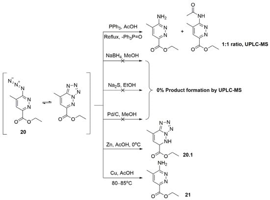 The classical approach to azide reduction involves the Staudinger reaction [25], followed by hydrolysis of the obtained iminophosphorane derivative. To streamline these steps, the reaction was conducted in glacial AcOH. However, UPLC-MS analysis revealed that the reaction proceeded only at the reflux conditions, leading to an inevitable formation of the undesired ethyl 6-acetamido-5-methylpyridazine-3-carboxylate by-product in a 1:1 ratio with a desired compound 21 (Figure 5). Moreover, Ph3PO, which is notoriously hard to remove from the reaction mixture, has been formed as a by-product [26]. Alternative reduction methods, including H2 (Pd/C), NaBH4/MeOH, and Na2S/EtOH failed to yield the desired product. Utilizing Zn dust in glacial AcOH led to the unexpected formation of ethyl 8-methyl-5,6-dihydrotetrazolo[1,5-b]pyridazine-6-carboxylate 20.1. It happened, likely, due to the predominant existence of the starting material as a tetrazolo[1,5-b]pyridazine tautomer (Figure 5).