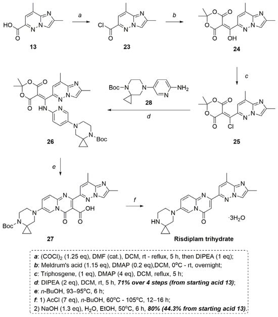 Meldrum’s acid has been acylated under basic conditions with 2,8-dimethylimidazo[1,2-b]pyridazine-6-carbonylchloride, prepared in situ from the corresponding acid 13. The obtained enol-compound has been subjected to a deoxychlorination reaction, yielding a corresponding vinylchloride derivative. A 1,4 addition/elimination reaction of the latter with tert-butyl 7-(6-aminopyridin-3-yl)-4,7-diazaspiro[2.5]octane-4-carboxylate 28, followed by heterocyclization, led to the N-Boc-protected carboxy-risdiplam. It finally underwent an acid-catalyzed Boc-deprotection/decarboxylation to give the target risdiplam trihydrate in about a 55% overall yield (from the 2,8-dimethylimidazo[1,2-b]pyridazine-6-carboxylic acid 13) [14].