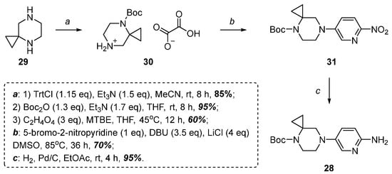 Synthesis of the tert-butyl 7-(6-aminopyridin-3-yl)-4,7-diazaspiro[2.5]octane-4-carboxylate 28 was carried out in a similar way to the original protocol [14] with one exception—4,7-diazaspirodiamine[2.5]octane 29 was used as the starting material instead of tert-butyl 4,7-diazaspiro[2.5]octane-4-carboxylate (Figure 7).
