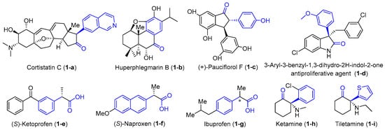 This bonding imparts electrophilic character to the iodine center, resulting in excellent reactivity (Figure 2b). Consequently, a large variety of synthetic routes to diaryliodonium salts have been developed [21,22,23,24,25,26,27,28,29,30]. With the rapid development of the related synthetic methods, diaryliodonium salts have been widely recognized and utilized in the field of organic synthesis chemistry, such as metal-catalyzed cross-coupling, transition-metal-catalyzed C-H bond activation/aromatization, α-position arylation of carbonyl compounds, asymmetric tandem cyclization and arylation of heteroatoms [31,32,33,34,35,36,37,38,39,40,41,42,43,44,45,46,47,48,49], and photoredox catalysis involving diaryliodonium salts [50,51,52]. Meanwhile, these protocols have been successfully applied to the rapid synthesis of natural products, pharmaceutical candidates, treatment of cancer, oral topical analgesic (S)-Ketoprofen (1-e), oral non-steroidal anti-inflammatory drug (S)-Naproxen (1-f) and Ibuprofen (1-g), as well as clinical drugs ketamine (1-h) and tiletamine (1-i).