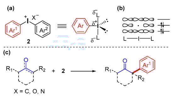 (a) General and T-shaped structure. (b) Orbitals in the hypervalent ω bond. (c) α-arylation of carbonyl compounds using diaryliodonium salts.