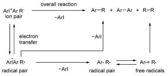 Based on the observed reaction pathway, the group proposed a radical-pair mechanism: electron transfer from a carbanion (R−) to the iodonium ion (Ar–I+–Ar) generates transient radical pairs (R· and Ar·), which predominantly recombine via radical substitution on diphenyliodine or direct coupling to yield arylative products. Competing pathways involving radical dissociation generate side products (Ar-R, Ar-Ar, R-R) through stochastic recombination (Scheme 2). Furthermore, the byproduct observed in Beringer’s group’s study could also be explained by this reaction mechanism.