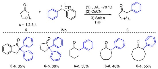 In 1997, Ryan’s research group [58] reported the transition metal-mediated α-arylation of cyclic ketones using diaryliodonium triflates (Scheme 3). Employing CuCN as a catalyst, the reaction between diaryliodonium triflate (2-b) and cyclic ketones (5) selectively produced α-phenylated derivatives (6). Notably, 5-membered cyclic ketones exclusively underwent diarylation (6-a, 6-b), while larger rings (6–8-membered) favored monoarylation (6-c, 6-d, 6-e.). This research group has developed efficient methods for synthesizing a wide range of stable diaryliodonium triflates and successfully applied them to the arylation of cyclic ketones. This work significantly expands both the synthetic methodologies for preparing diaryliodonium salts and their applicability as arylating agents.