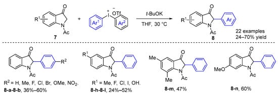 In 2015, Liu and co-workers [59] reported a t-BuOK-promoted method for the α-arylation of indolone derivatives (7) with diaryliodonium salts, achieving monoarylated indolone derivatives (8) in moderate-to-good yields (24–60%) (Scheme 4). This procedure demonstrated remarkable compatibility with a variety of functional groups and displayed a wide substrate applicability, showing adaptability to varying electronic and steric conditions. Moreover, transformation of monoarylated indolinones with diverse electrophiles has been demonstrated, enabling access to bioactive compounds featuring 2-arylated indolinone cores.