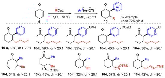 In 2015, Zhang’s research group [60] reported Cu-mediated one-pot Michael addition/α-arylation strategy to construct α-aryl-β-substituted cyclic ketone scaffolds (10) using cyclohex-2-en-1-one (9) as the substrate and diaryliodonium salts as arylating agents (Scheme 5). The transformation exhibits advantages including commercially accessible reagents, broad substrate tolerance, moderate-to-excellent yields, and high diastereoselectivity.