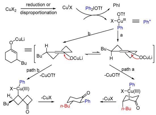 - Pan, J.-L.; Chen, T.; Zhang, Z.-Q.; Li, Y.-F.; Zhang, X.-M.; Zhang, F.-M. A Cu-mediated one-pot Michael addition/α-arylation strategy using diaryliodonium salt: Direct and efficient approach to α-aryl-β substituted cyclic ketone scaffolds. Chem. Commun. 2016, 52, 2382–2385. [Google Scholar] [CrossRef] [PubMed]