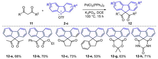 In 2017, Wen and co-workers [61] reported a palladium-catalyzed dual C–C arylation reaction using cyclic diaryliodonium salts (2-c) and methylene-containing 1,3-dicarbonyl compounds (11) as substrates (Scheme 7). This method enabled the concise and efficient construction of structurally diverse fluorene derivatives (12) bearing all-carbon quaternary carbon centers. Moreover, the protocol was extended to synthesize novel pharmacologically active spirofluorene derivatives incorporating barbituric acid or indanone moieties, demonstrating distinctive synthetic value.