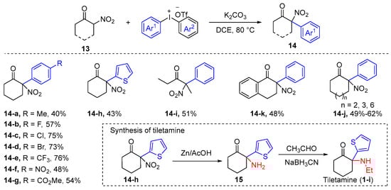 In 2019, Zhang’s research group [62] extended the frontiers of metal-free ketone functionalization by pioneering the transition metal-free α-arylation of α-nitro ketones (13) mediated by diaryliodonium salts. The protocol delivered structurally diverse α-aryl-α-nitro ketones (14) in synthetically viable yields (40–76%), while demonstrating exceptional functional group compatibility and extensive substrate generality (Scheme 8). Additionally, this group achieved a concise and efficient synthesis of the clinical drug Tiletamine (1-i) via this method through a three-step transformation with a 32% overall yield. In summary, the synthetic strategy developed by this research group not only features mild reaction conditions and broad substrate scope, but enables the production of synthetically valuable products.