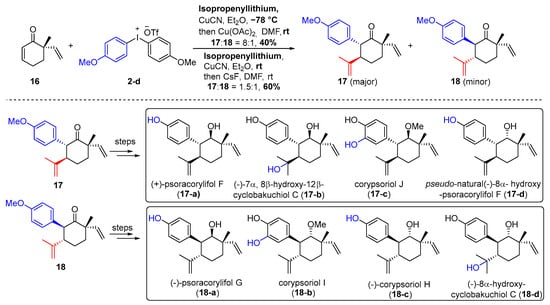 In 2023, our group [63] further achieved enantioselective divergent total syntheses of several meroterpenoids. (Scheme 9) The key transformations involved a one-pot Michael addition/α-arylation of an enone (16), utilizing diaryliodonium salts (2-d) as the arylating reagent to install the α-aryl group, yielding the desired arylation products (17 and 18). The authors have further expanded the use of diaryliodonium salts as arylation reagents in the total synthesis of meroterpenoid natural products.