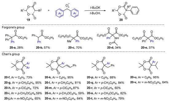 In 1963, Forgione and co-workers [64] pioneered the α-phenylation of ester carbonyl compounds (19) using diphenyliodonium chloride as the arylating reagent. This transformation was achieved in a t-BuOK/t-BuOH system under reflux conditions, delivering α-arylated products (20-a–20-e) in modest yields (28–70%). They discovered that spatial steric hindrance significantly impacted the reaction. Furthermore, the benzhydrylation products, synthesized in an early exploratory phase without optimization, yielded suboptimally but are amenable to improvement. In 1987, Chen et al. [65] utilized the same reaction system to achieve the α-arylation of isopropylidene malonate and its 5-substituted derivates. The reaction afforded diarylated or monoarylated products (20-f–20-v) in good-to-excellent yields (Scheme 10).