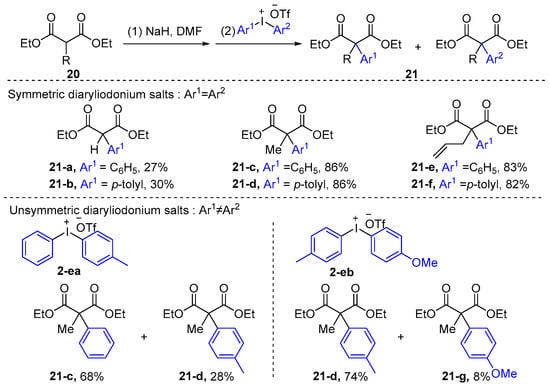 In 1999, Chang and colleagues [66] reported the α-arylation of β-ketoester substrates (20) employing diaryliodonium salts as arylating agents under basic promotion (Scheme 11). The experimental results demonstrated that the corresponding aryl derivatives (21) were obtained in moderate-to-good yields under mild conditions. However, when Ar1 and Ar2 are distinct groups, the arylation reaction exhibits poor regioselectivity. This limitation significantly constrained the synthetic utility of unsymmetrical diaryliodonium salts. This challenge was subsequently addressed in later research.