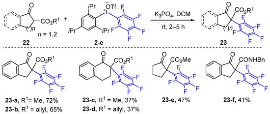 In 2014, Shibata and co-workers [67] synthesized a series of sterically hindered, unsymmetrical diaryliodonium salts, including pentafluorophenyl and triisopropylphenyl moieties (2-f). Employing these electrophilic aryl transfer reagents in conjunction with K3PO4 as the base, the group achieved α-pentafluorophenylation of β-ketoesters and β-ketoamides (22), affording α-pentafluorophenylated 1,3-dicarbonyl compounds featuring all-carbon quaternary stereocenters (23) (Scheme 12).