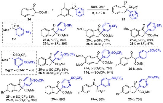 Subsequently, the group [68] developed a one-pot synthesis of unsymmetrical SF5-aryl-λ3-iodanes (2-g), employing them for SF5-arylation of 1,3-dicarbonyl compounds (24) under mild conditions (NaH/DMF) to yield SF5-functionalized derivatives (25-a–25-l). This methodology was extended to the arylation of diverse nucleophiles (e.g., phenols, anilines, carboxylates) using base or Cu catalysts. In 2017, the same group [69] synthesized SO2CF3-aryl/pyridyl iodonium salts (2-h), enabling trifluoromethanesulfonylation of C-/heteroatom-nucleophiles and trifluoromethanesulfonylpyridylation under some conditions, affording α-aryl/pyridyl trifluoromethanesulfonyl ketones in high yields (Scheme 13). Collectively, these approaches address regioselectivity challenges in unsymmetrical diaryliodonium chemistry and provide efficient routes to SF5- and SO2CF3-containing aryl/heteroaryl scaffolds—valuable precursors for bioactive compounds, catalysts, and chiral molecules.
